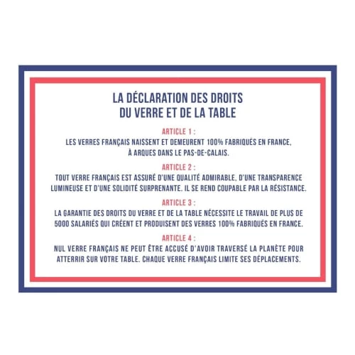 Une collection non sans humour de gobelets iconiques pour le quotidien qui vous invite à acter citoyens et consommer local !A CHAQUE VERRE, SON PERSONNAGE:Georges l’Idéaliste, Louis le Royaliste, Charlotte la Républicaine ou encore Antoinette la Provocante … redécouvrez avec humour la révolution Française.FABRICATION FRANCE : Découvrez le packaging humoristique de la boite de 6 verres la déclaration des droits du verre et de la table.UN ACTE CITOYEN: Le Verre Français met en avant la rigueurl et la passion qui animent les femmes et des hommes qui, à Arques, dans le Pas-de-Calais, transmettent depuis plus de 200ans un savoir-faire exceptionnel : la fabrication du verre. LUMINARC, FEEL CREATIVE : Depuis des décennies, Luminarc traduit l’art de vivre à la française par des formes, des motifs et des couleurs qui façonnent une vaisselle toujours actuelle et facile à vivre. Tendance et astucieuse, la créativité made in Luminarc s’invite aujourd’hui plus que jamais à votre table.